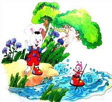 小兔子灵机一动,想出了一个绝妙的好办法,它说:“小蚂蚁,你别伤心,我有办法了!”小兔拿起了一根树枝递给了小蚂蚁,再脱下一只新雨鞋,小心翼翼地放入河中,对小蚂蚁说:“小蚂蚁,快跳进我的雨鞋里来,拿着这根小棒子划过河!”小蚂蚁上了“船”,用这根树枝做浆,顺利渡过了河。