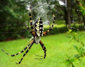 无论从举止还是从颜色上讲,条纹蜘蛛是我所知道的蜘蛛中最完美的一种。在它那胖胖的像榛仔仁一般大小的身体上,有着黄、黑、银三色相间的条纹,所以它的名字叫“条纹蜘蛛”。它们的八只脚环绕在身体周围,好像车轮的辐条。