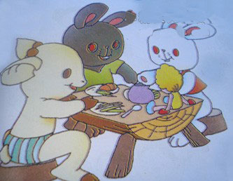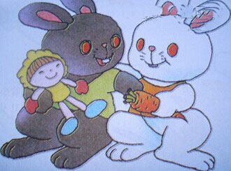白白遇到一只小黑兔。小黑兔说:“你好!让我玩玩你的娃娃好吗?”白白同意了。小黑兔高兴极了,它送给白白一根胡萝卜。
