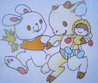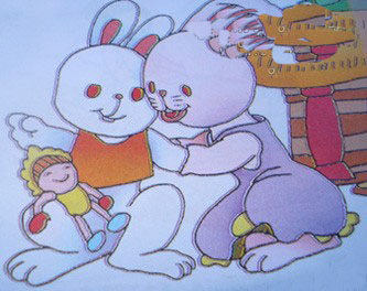 小兔白白整天跟着妈妈,一个朋友也没有。一天,妈妈给了白白一个娃娃,说:“出去找朋友玩吧!”