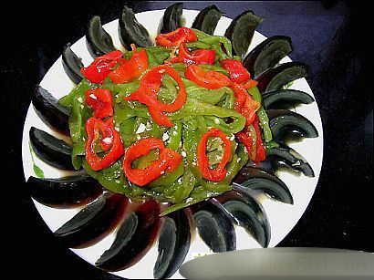 烧辣椒拌皮蛋的制作材料:主料:青椒,红辣椒,鸡精,盐,香油,醋,皮蛋