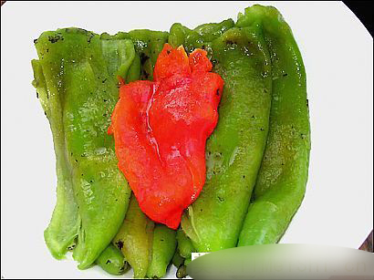 把上面的黑皮洗掉(用手一搓,皮就会下来的),我洗了三盆水:),最后用冷开水过一下看,这就是去了死皮的辣椒:)