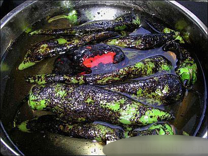 等辣椒全身都变黑,变软后,放到事先准备好的一盆自来水里(烧好一个就放进去一个泡着)
