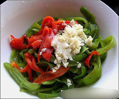 用手把辣椒撕成小条,放鸡精、盐、香油、醋和一点点大蒜末拌匀(为了方便姐妹好看,我这是还没开始拌的