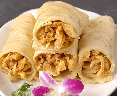6、将熏肉剁碎或切条或切薄片,加适量葱丝和甜面酱用薄饼卷食即可。